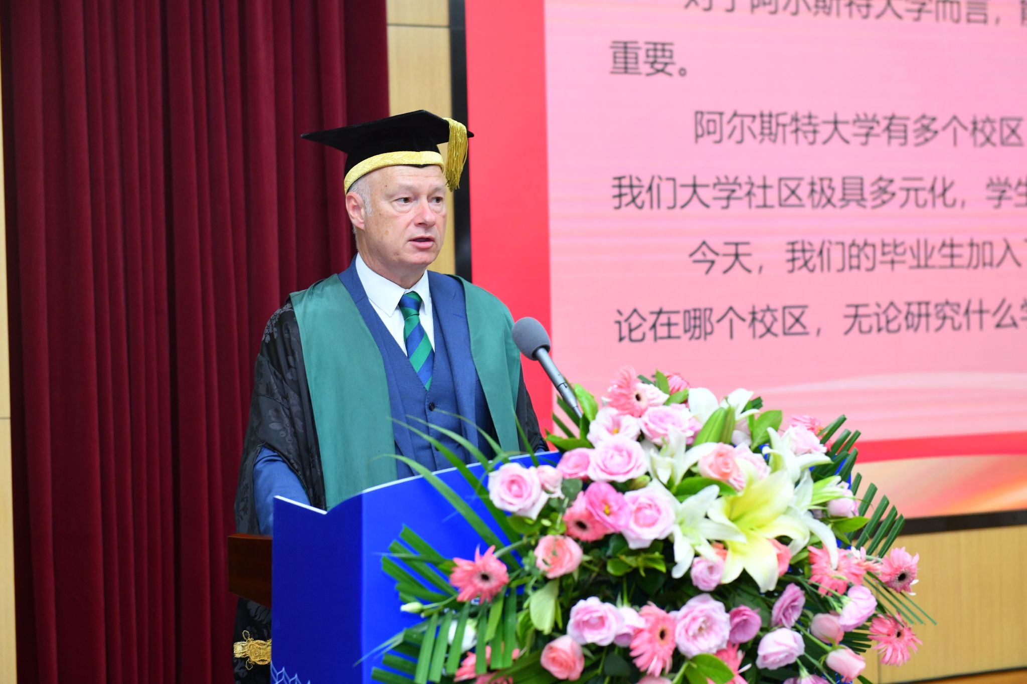 Paul Bartholomew在致辞中表示,德赢官网Vwin作为阿尔斯特大学的重要合作伙伴,为学生学业发展和成长提供了广阔空间,他寄语毕业生发扬诚信、卓越和仁爱的理念,增强塑造未来、激励他人和影响世界的能力,并祝愿全体毕业生前程光明。