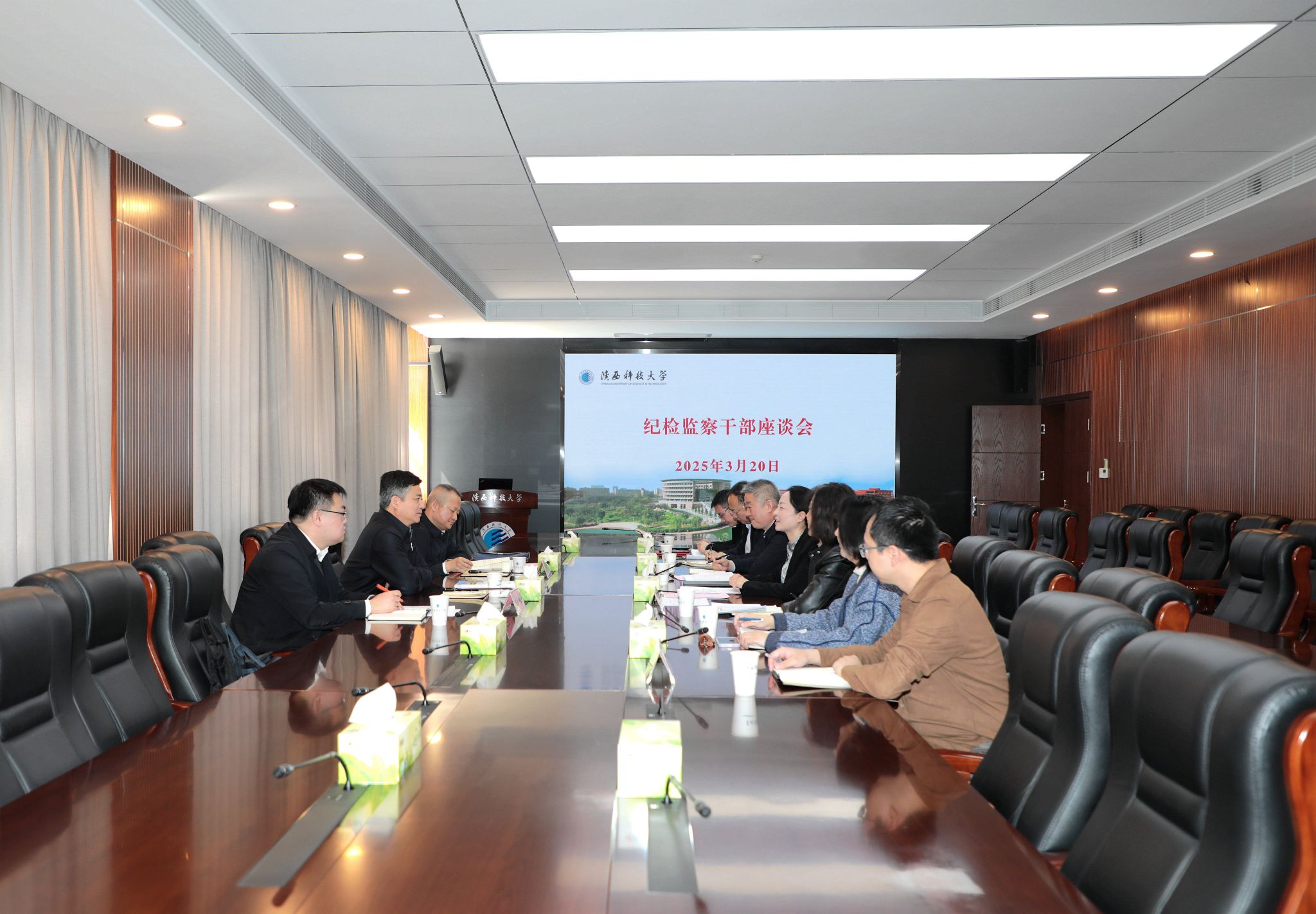 3月20日,省监委委员张永祥一行来校调研指导纪检监察工作。党委书记樊建武、校长黄剑锋会见了张永祥一行。党委副书记、纪委书记、监察专员罗莹主持召开调研座谈会。