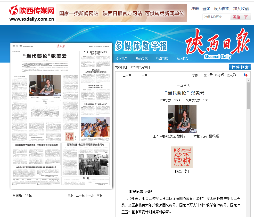 5月31日,《陕西日报》教育版以《三秦学人 “当代蔡伦”张美云》为题报道了德赢官网张美云教授的教学科研事迹,全文转载如下:
