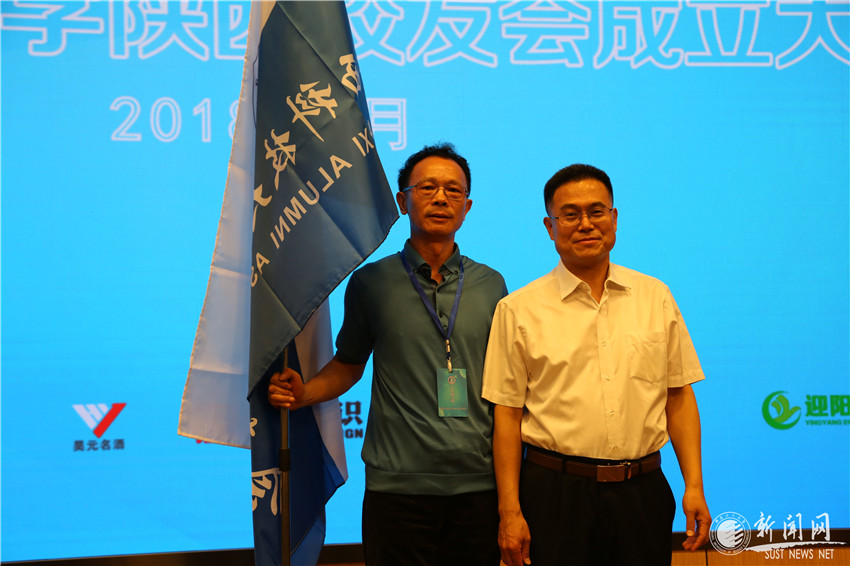 马建中代表校友总会为陕西校友会第一届理事会成员授旗并代表学校赠送礼品。