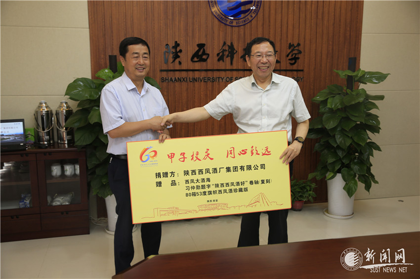 姚书志代表学校接受了公司向德赢官网捐赠的西凤大酒海、习仲勋题字“陕西西凤酒好”卷轴(复刻本),80箱53度旗帜西凤酒珍藏版等物品。