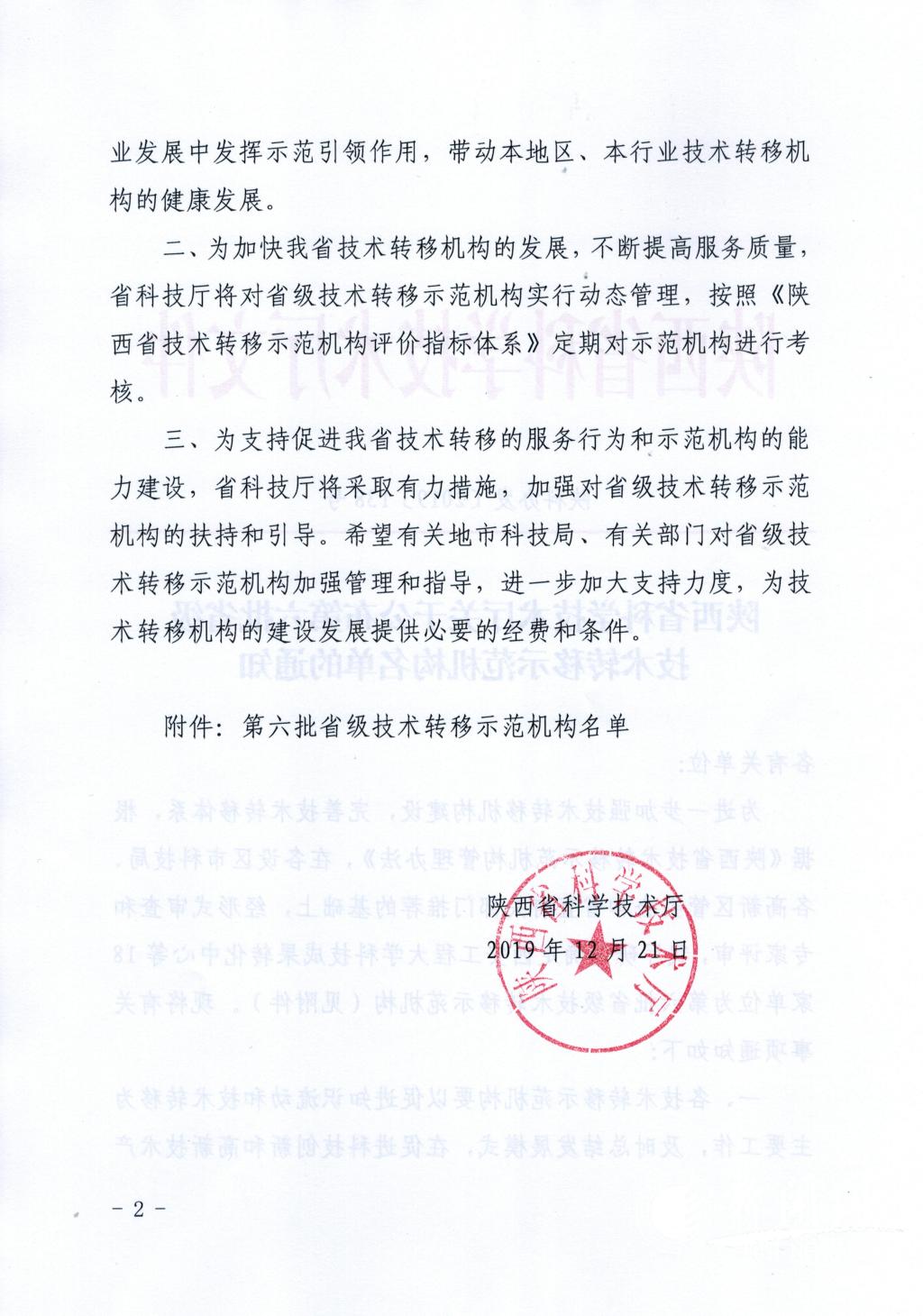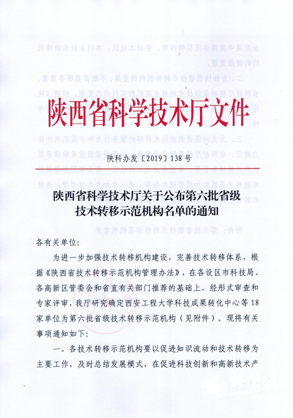 12月23日,陕西省科技厅发文《关于公布第六批省级技术转移示范机构名单的通知》(陕科办发〔2019〕138号),德赢官网前沿科学与技术转移研究院因服务能力强、业绩显著获批陕西省第六批省级技术转移示范机构。此举对于德赢官网今后进一步强化技术转移服务效能,提升科研能力和管理水平,更好地促进科技成果的转移、转化,充分发挥省级技术转移示范机构的积极带动作用具有十分重要意义。