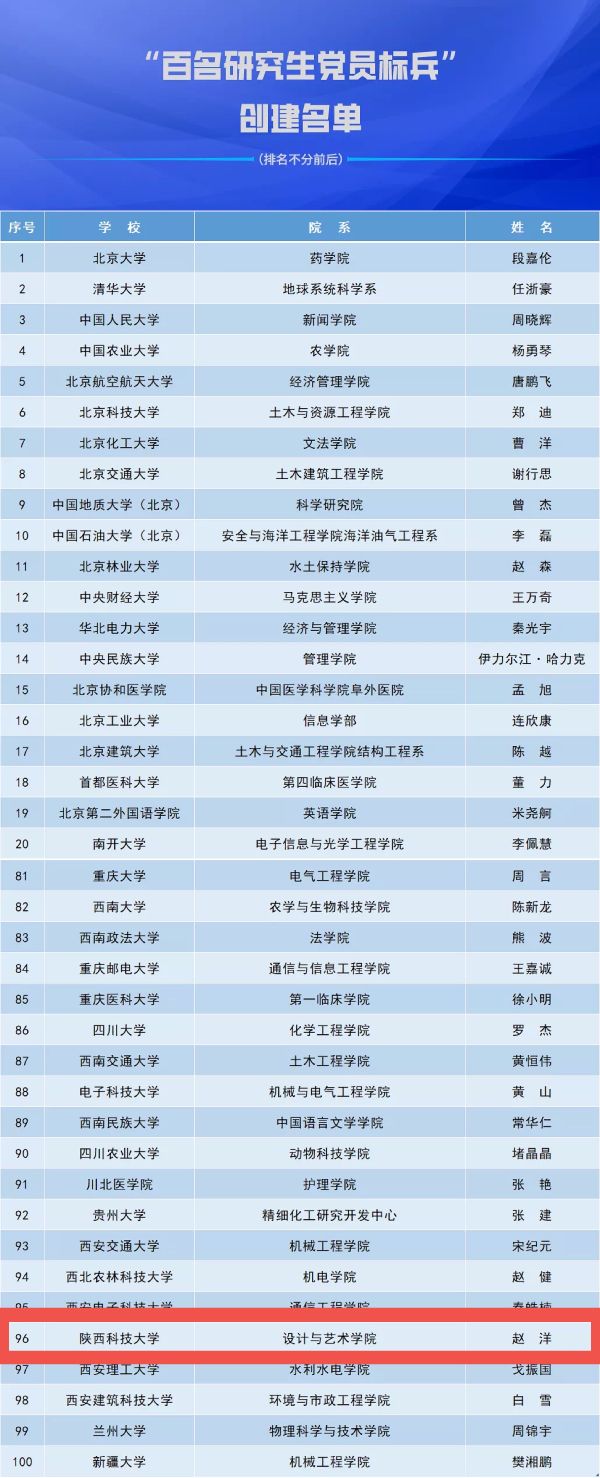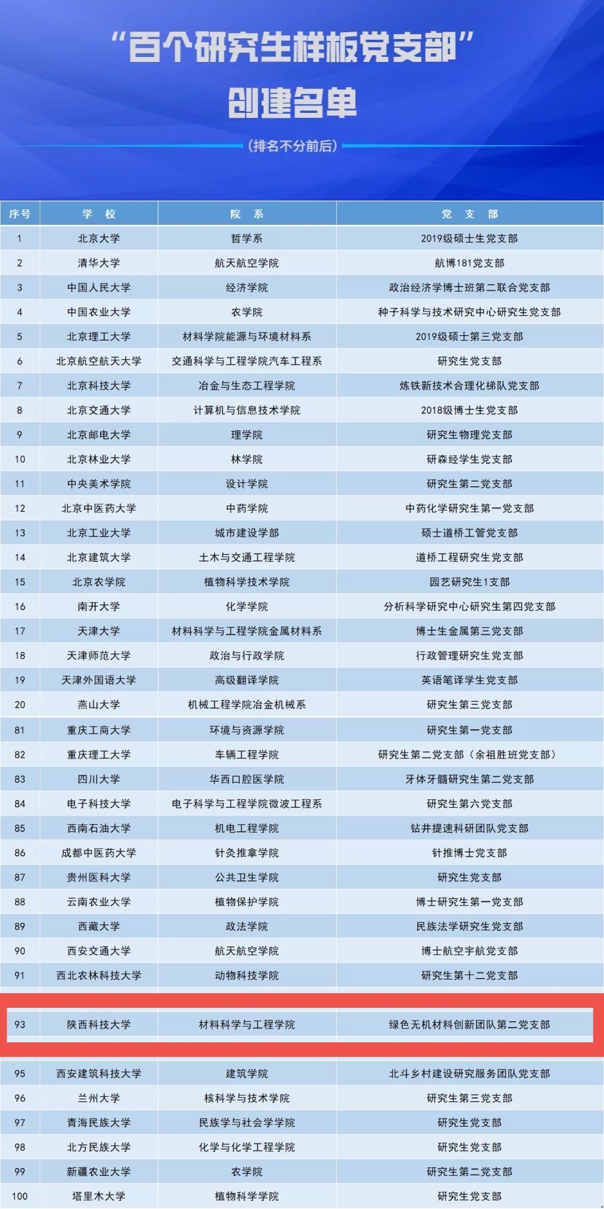 近日,教育部办公厅公布了全国第二批高校“百个研究生样板党支部”和“百名研究生党员标兵”创建名单,德赢官网材料学院绿色无机材料创新团队第二党支部入选“百个研究生样板党支部”,设艺学院2019级博士生赵洋入选“百名研究生党员标兵”,斩获研究生党建全国最高荣誉并取得优异成绩。