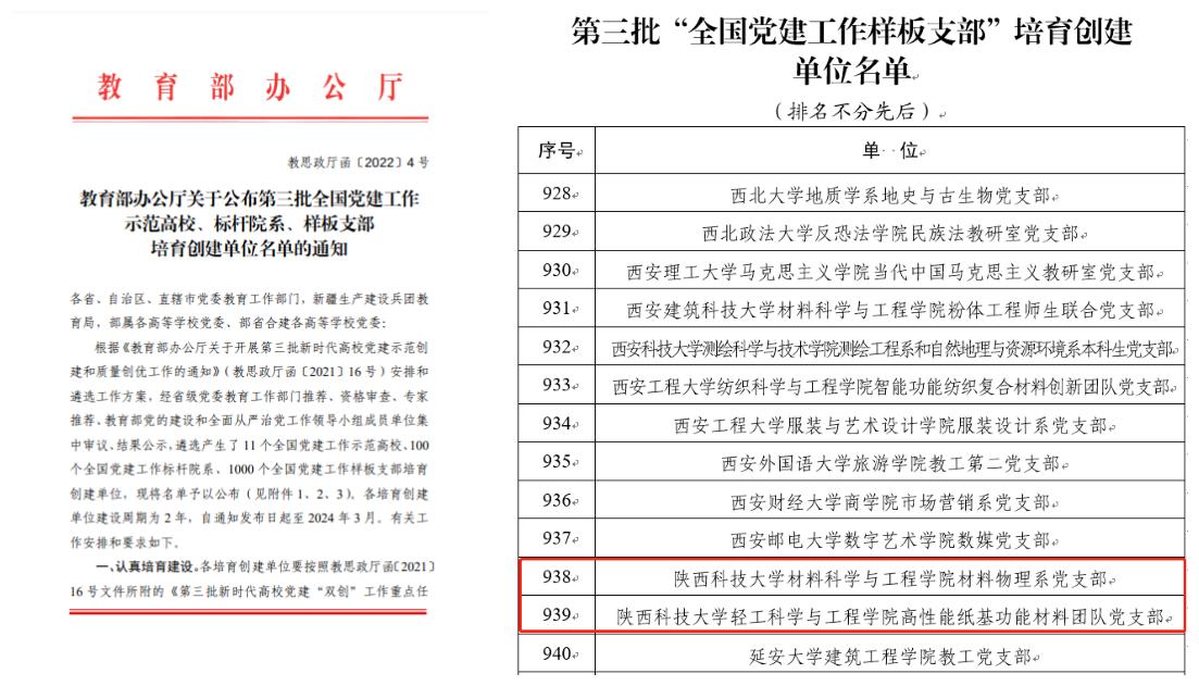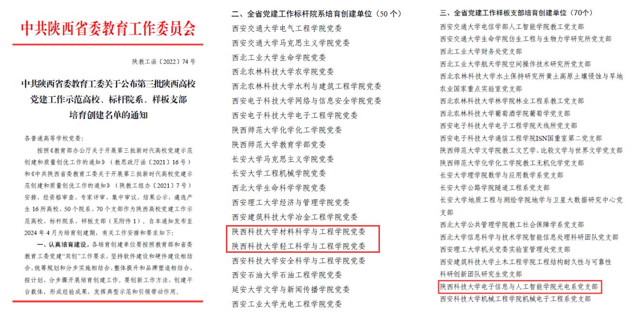 近日,教育部和省委教育工委陆续公布了第三批新时代高校党建示范创建和质量创优工作(以下简称“双创”工作)评审结果,德赢官网材料科学与工程学院材料物理系党支部、轻工科学与工程学院高性能纸基功能材料团队党支部入选“全国党建工作样板支部”,材料科学与工程学院党委、轻工科学与工程学院党委入选“全省党建工作标杆院系”,电子信息与人工智能学院光电系党支部入选“全省党建工作样板支部”。这是继德赢官网8个基层党组织入选首批、第二批党建“双创”单位之后,又有5个基层党组织入选第三批党建“双创”培育创建单位。
