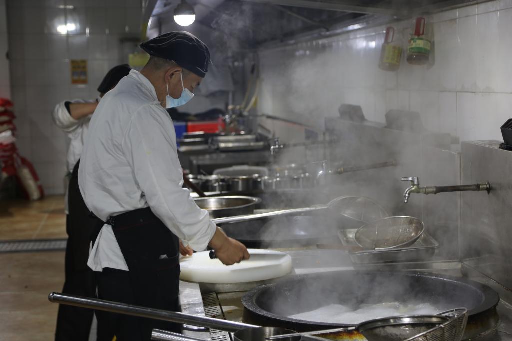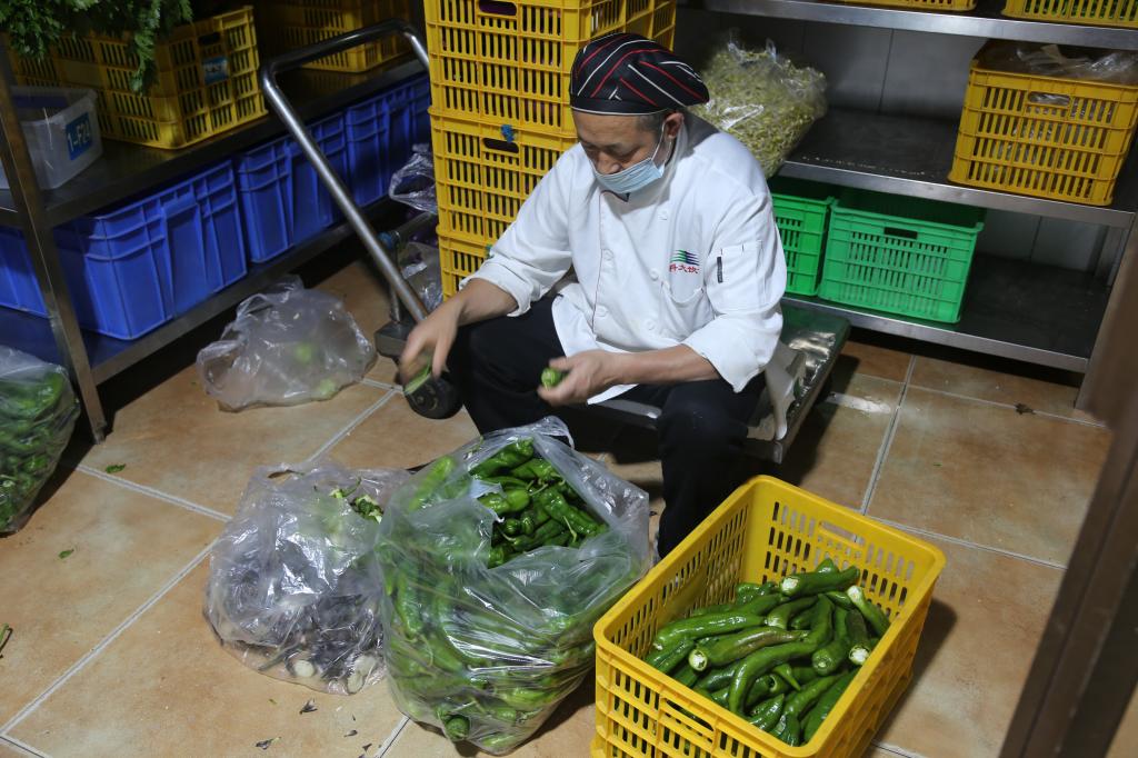 沁园一餐厅厨师长白海生刚忙完早餐售卖,又开始准备午餐,他一边检查中午要用的蔬菜,一边说:“现在是上午10点,我们已经工作了8小时了,接下来还要忙8个小时,每人每天的劳动时长大约是16个钟头左右,之前人手充足的时候还好一点,现在疫情封校期间,我们每个炊事员几乎都干着两个人的活,忙得水都顾不上喝。”