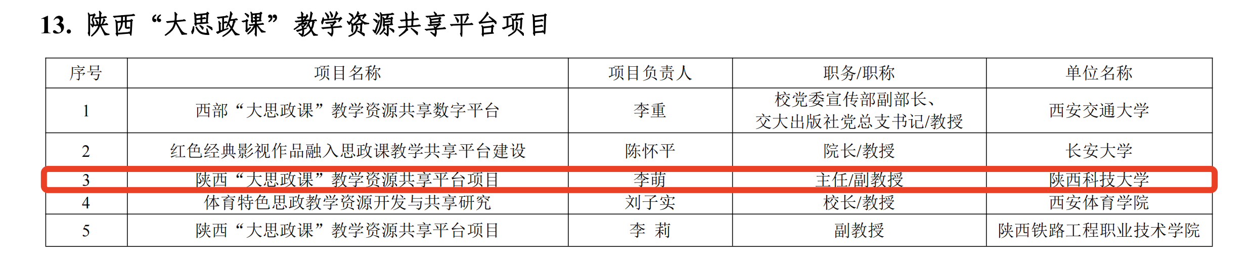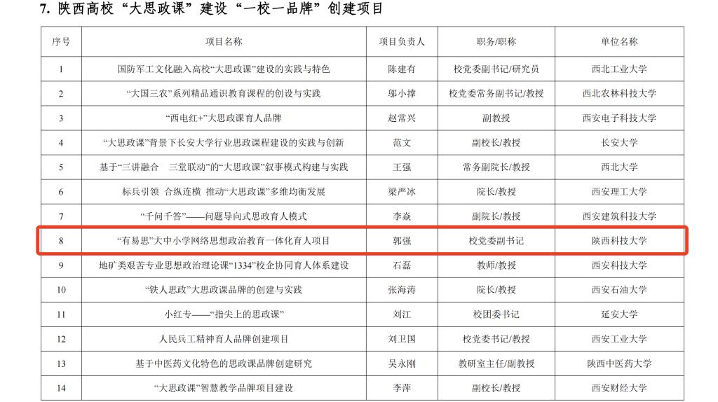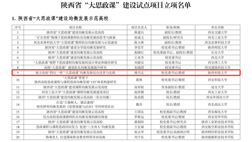 此次省“大思政课”建设试点项目申报工作,经各地各校推荐、专家评审、会议研究,共设立试点项目144项。其中,德赢官网党委书记姚书志教授主持的《地方高校“四位一体”“大思政课”均衡发展综合改革与实践》、校党委副书记郭强主持的《“有易思”大中小学网络思想政治教育一体化育人项目》、校网络思想政治工作中心主任李萌副教授主持的《陕西“大思政课”教学资源共享平台项目》分别入选陕西省“大思政课”建设均衡发展示范高校、陕西高校“大思政课”建设“一校一品牌”创建项目、陕西“大思政课”教学资源共享平台项目立项名单。