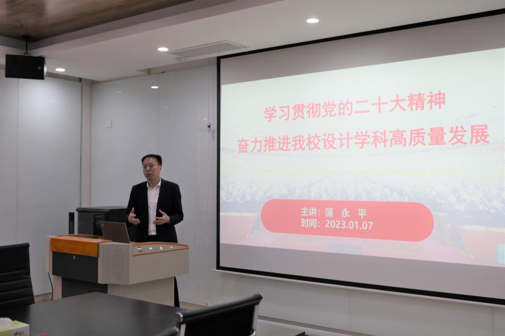 蒲永平从全面理解和深刻把握党的二十大主题,牢记三个“务必”切入,对党的二十大会议情况及报告内容进行了要点领学;结合国家“十四五”及2035发展规划目标,解读关于教育科技人才的重要论述;从推进文化自信自强,繁荣发展文化事业和文化产业等方面,分析关于文化的重要论述;结合大学职能,重点围绕设计学科高质量发展,从学科和人才的角度详细阐述了如何贯彻落实党的二十大精神。