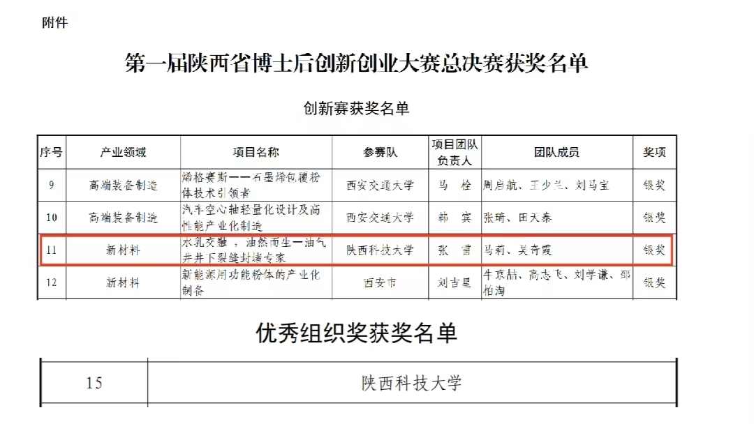 近日,由陕西省委组织部、省委教育工委、省人社厅及省教育厅联合举办的第一届陕西省创新创业大赛获奖名单公布,德赢官网轻工科学与工程学院(柔性电子学院)师资博士后张雷的项目《水乳交融,油然而生—油气井井下裂缝封堵专家》获创新赛银奖,学校荣获优秀组织奖。
