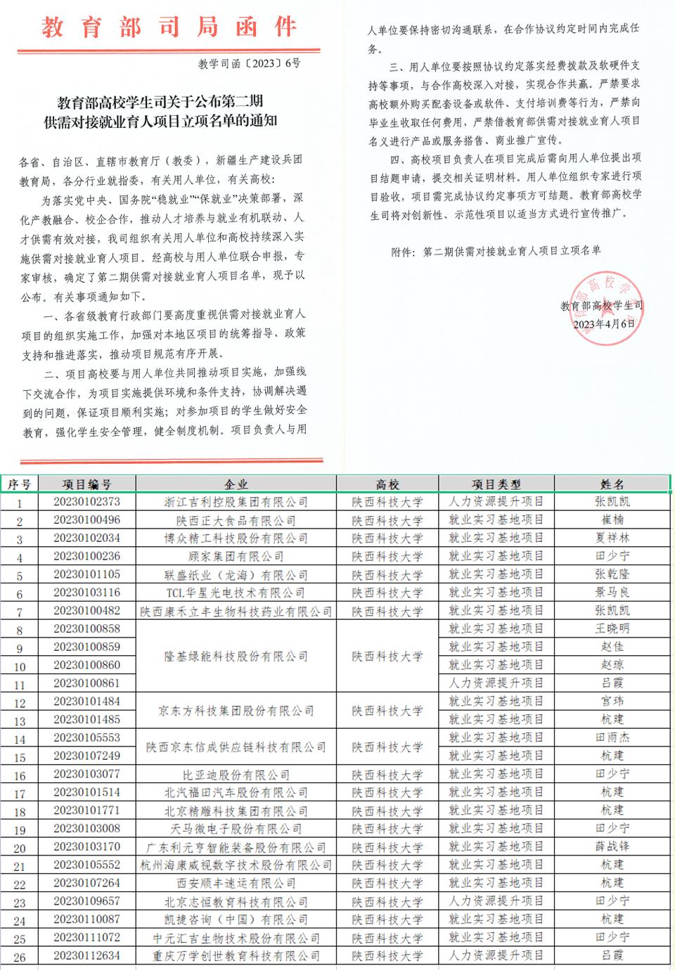 近日,教育部发布了《教育部高校学生司关于公布第二期供需对接就业育人项目立项名单的通知》(教学司函〔2023〕6号),德赢官网Vwin与比亚迪股份有限公司、顾家集团有限公司,隆基绿能科技股份有限公司、浙江吉利控股集团有限公司、天马微电子股份有限公司、杭州海康威视数字技术有限公司、联盛纸业(龙海)有限公司等21家单位合作的26个项目获批立项。
