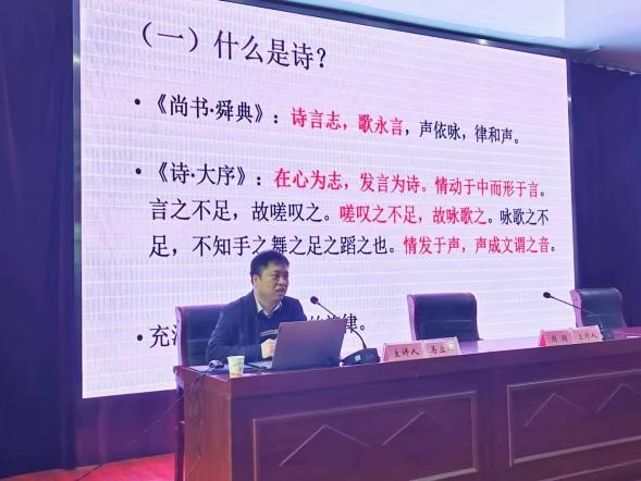马立军教授首先从什么是诗、什么是词、诗与词的关系是什么等三个问题入手,依次阐明诗、词各自的特点、分类以及诗词的分野与背后的文学观念等。然后对知人论世、以意逆志、诗无达诂等基本原则,滋味、意境、寄托、用典等具体方法,皆做了深入浅出的讲解。最后推荐了一些诗词鉴赏方面的名著,供与会人员进行拓展阅读。古典诗词本身即具有无穷的魅力。而马立军教授在讲座过程中一方面坚持利用经典作品展开分析,让听众始终有一种熟悉的感觉。另一方面又以别致的视角与细致的分析,揭示了这些诗词中含而不露的精妙之处,令听众耳目一新,收获良多。一个半小时讲座中,现场听众认真而又专注,学习氛围浓厚。