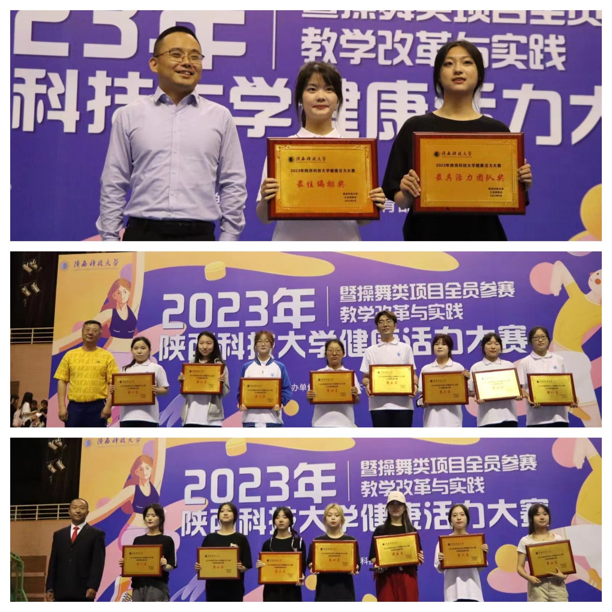 本次大赛有来自2022级啦啦操、健美操体育选项课的共648人自由组合成的66支参赛队伍。比赛现场参赛队伍青春洋溢的精神风貌、个性鲜明的队伍名称、团结协作的合作精神、努力拼搏的体育竞争意识,都给参会嘉宾及裁判员和观众留下了深刻的印象。经过3个小时的比赛,在啦啦操、健美操两个项目上最终评选出啦啦操项目的前八名、健美操项目前八名及“最具活力团队”“最佳编排”等奖项。