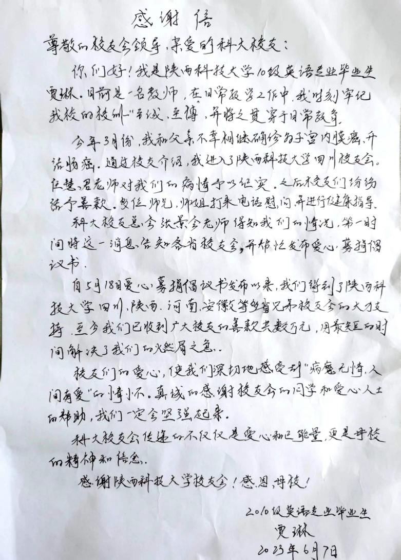 贾琳系德赢官网文理学院英语专业14届校友。毕业后在河南省南阳市西峡县某镇小学任教,夫妇二人均为人民教师。今年3月,贾琳和父亲相继罹患癌症。一时间,巨大的精神压力和经济压力让这个家庭陷入困境。校友总会得知这一情况后,第一时间联系校友贾琳,了解病情,表达母校的关心和慰问。同时,为帮助校友走出困境,本着关爱校友、帮助校友的原则,校友总会联合四川校友会、陕西校友会、河南校友会向广大校友们发出倡议,希望大家能够在力所能及范围内向贾琳及其家庭伸出援手。文理学院随即在学院群、专业群和班级群发出捐款倡议,号召学院老师和校友向贾琳表达关爱之情。校友们纷纷慷慨解囊,奉献爱心。还有校友主动联系校友总会,表示愿意帮助联系手术相关事宜。短短半月时间,校友总会、文理学院和全国各地的校友们为贾琳筹款5万余元,让这个家庭坚定了抗击病魔的信心。