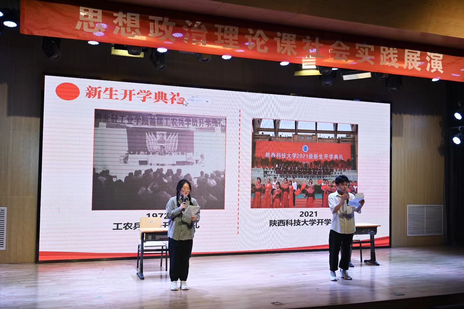 本次实践教学展演在人文楼小剧场举行,分为“科大变迁”和“改革开放”两个篇章。或许是一张照片,一段视频,又或者是一次采访,一段演讲,同学们追寻“三创两迁”的历史足迹,通过实践触摸改革开放的发展脉络。