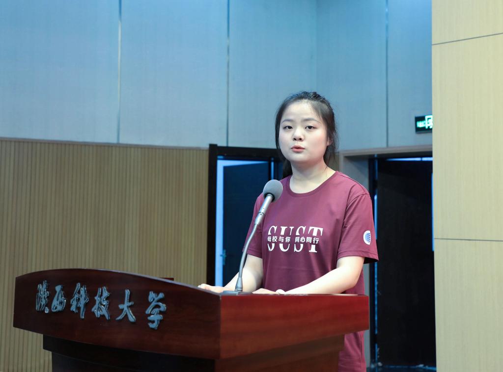 材料学院材物192班韩思雨同学作为2023届校友联络员代表发言。她说:“感谢母校和老师对我们的信任与支持,不论在何地、何种岗位,‘科大人’都将成为我们人生名片上最为炙热的符号。”她表示,作为新的校友联络员,会时刻牢记身份,传承母校“三创两迁”大学精神,宣传母校“至诚至博”大学形象。立足个人梦、科大梦有机结合,热心参与、投入到校友工作中,为校友和母校的协同发展贡献力量。