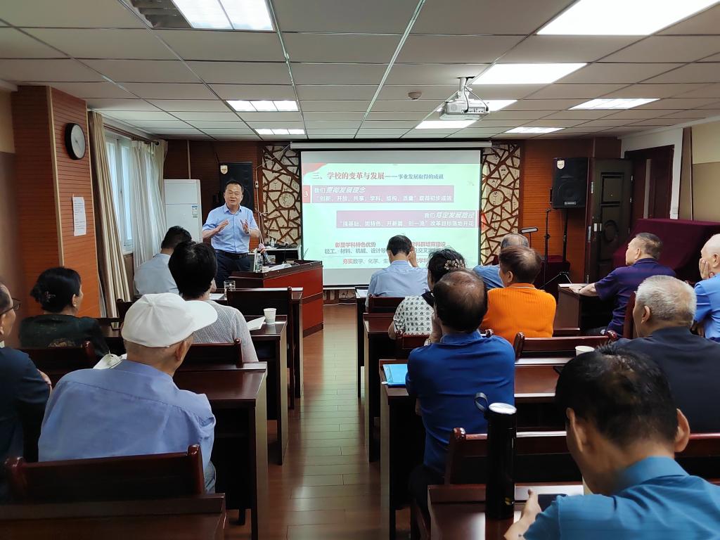党课从三个层面由大到小为老同志们进行了深入的讲解。一是国家的变革与发展---构建全面开放新格局的历史进程。从“引进来”到“走出去”,我国逐渐形成了全方位、多层次、宽领域的对外开放新格局,并一跃成为开放型经济大国。对外开放为推动国家实现从站起来到富起来、再到强起来的历史性跨越作出了重要贡献。二是高等教育的变革与发展---从精英化到大众化进而迈入普及化的三个阶段的历史进程。我国建成了一个世界规模最大的高等教育体系,不仅为科教兴国、人才强国战略提供了坚实支撑,也在日益开放交流中,让中国不断走向世界舞台中央,成为民族复兴伟业的强大基石。三是学校的变革与发展---从“三创两迁”到“而今迈步从头越”的历史主动。回望了学校“十三五”砥砺奋进征程,在党建、学科建设、师资队伍建设、科研创新等诸多方面取得的成就。又从坚持党建引领,党的建设和思想政治工作得到全面加强;立足发展阶段,推动“外延和内涵并行,以内涵建设为重”得到有力彰显;贯彻发展理念,“创新、开放、共享,学科、结构、质量”取得初步成效;笃定发展路径,“强基础、固特色、开新篇、创一流”改革目标落地开花;构建“四新”发展格局等五个方面向老同志介绍了学校“十四五”开局两年多以来推动事业高质量发展主要举措和取得的成绩。