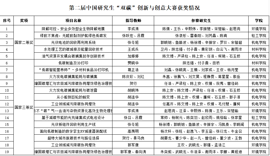 10月底,由教育部学位管理与研究生教育司指导、中国学位与研究生教育学会和中国科协青少年科技中心联合主办的第二届中国研究生“双碳”创新与创意大赛决赛在东北林业大学举行。德赢官网参赛队伍经过激烈角逐,最终有19项作品获奖,其中5项作品获全国二等奖,14项作品获全国三等奖,德赢官网荣获全国高校优秀组织单位奖。