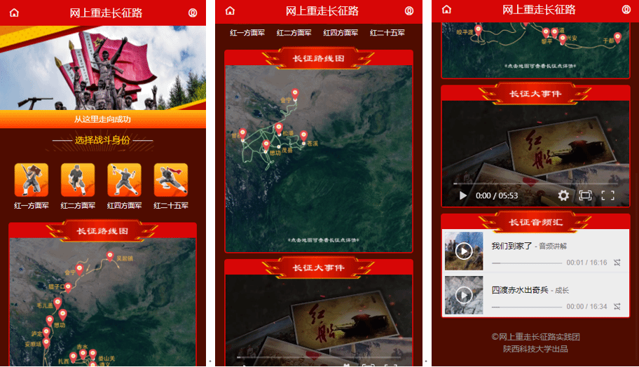 该作品通过对长征历史背景和整个历程的梳理,以长征动态地图的新技术,创新推出网上重走长征路互动学习平台,让广大师生在网上身临其境地重走长征路,重温长征艰难,弘扬长征精神。