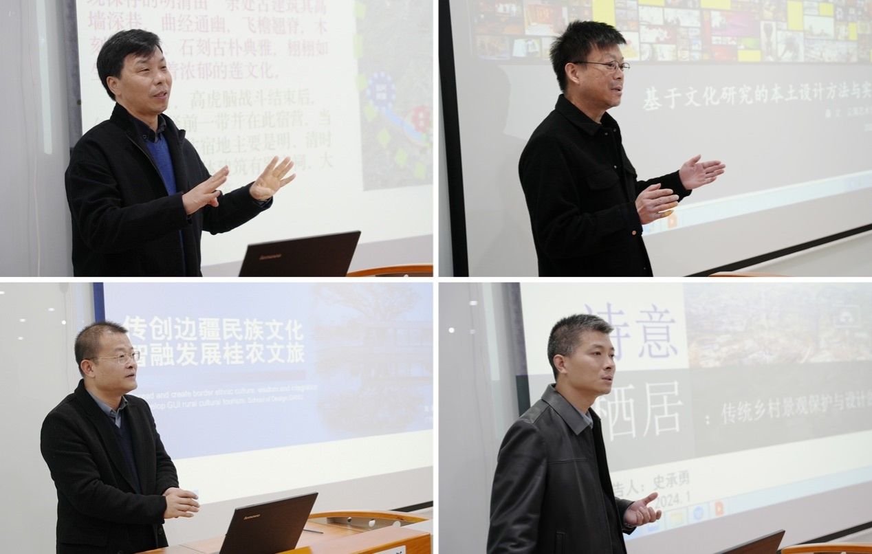 研讨会分上午场主旨演讲和下午场专题报告,线上线下同步。广东工业大学艺术与设计学院卢世主教授、云南艺术学院研究生处处长森文教授、广西师范大学设计学院院长刘涛教授、西安科技大学艺术学院院长杨惠珺教授、西北农林科技大学风景园林艺术学院系主任史承勇副教授分别带来“革命老区乡村振兴设计创新”“基于文化研究的本土设计方法与实践”“传创边疆民族文化、智融发展桂农文旅”“设计赋能乡村振兴--传统秦绣的语言转化为例”“诗意栖居:传统乡村景观保护与设计的思考”等主旨演讲。主旨演讲由刘宗明主持。