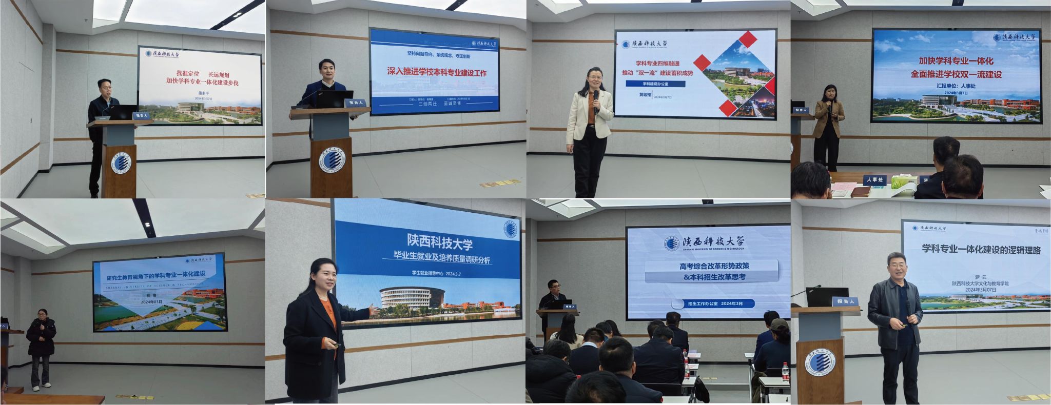 教务处、学科办、人事处、研究生院、学工部、招生办、文教学院负责同志分别基于前期调研分析结果及德赢官网学科发展现状做专题报告。报告人梳理亮点、剖析不足、规划路径、明确重点,围绕深入推进本科专业建设工作、学科专业四维融通、学科专业一体化建设视域下师资队伍建设、研究生教育视角下的学科专业一体化建设、毕业生就业与培养质量调研分析、高考综合改革形势与学校本科招生改革、学科专业一体化建设的逻辑理路等方面内容进行汇报。