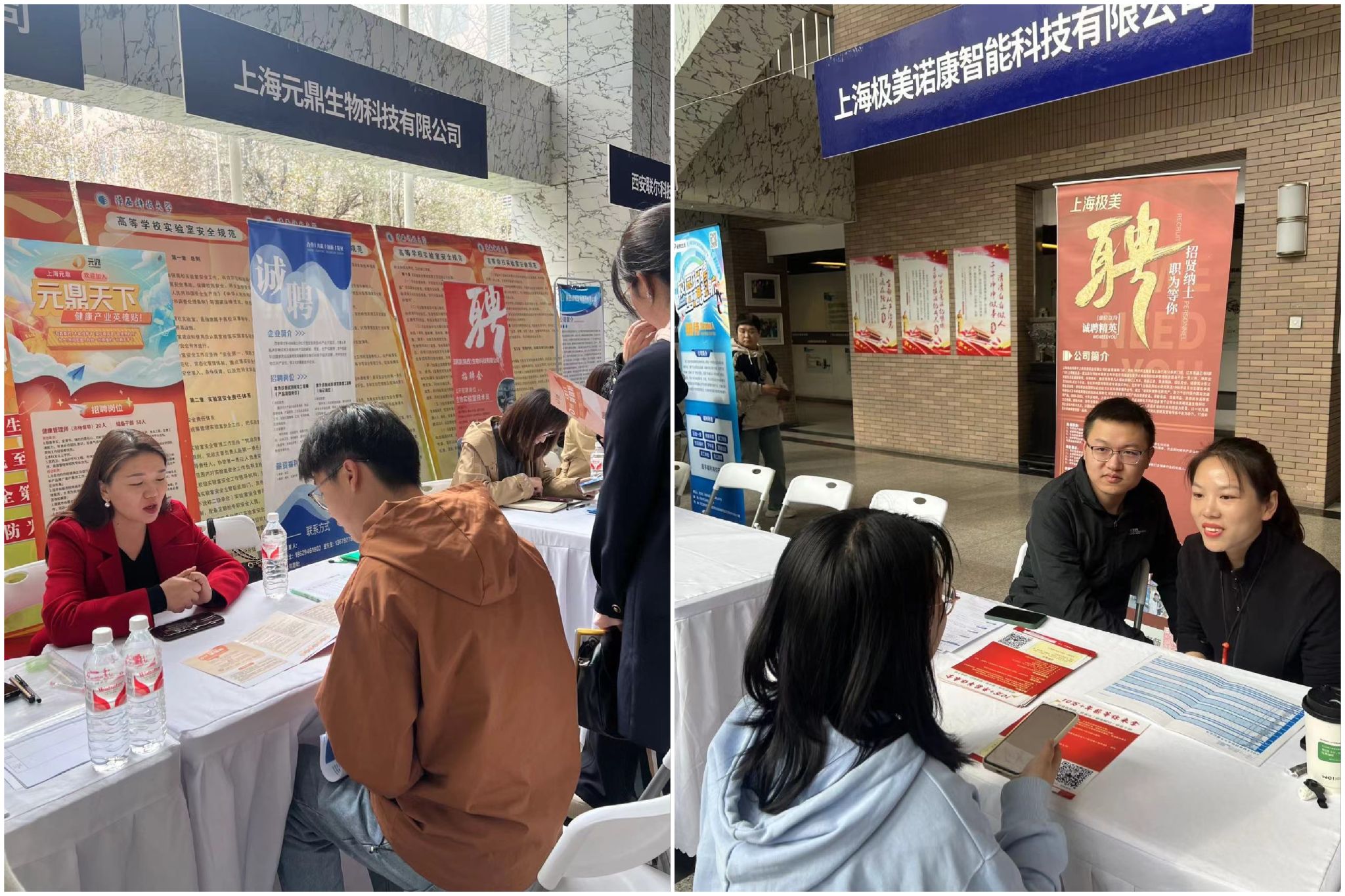 招聘会期间,校友企业上海元鼎生物科技有限公司和承葛医药集团进行了专场宣讲,为学弟学妹们介绍了企业文化、品牌简介、发展前景、招聘对象、岗位需求等内容,为同学们提供多层次的职业发展路径。