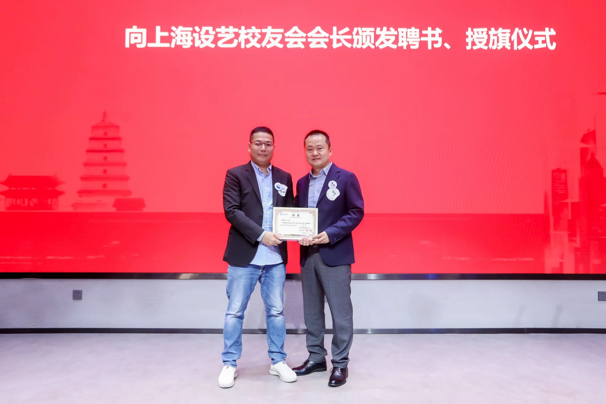 李学军为上海设艺校友会会长陈锦枝颁发聘书。陈锦枝为上海设艺校友会常务副会长、副会长、秘书长、副秘书长颁发聘书。