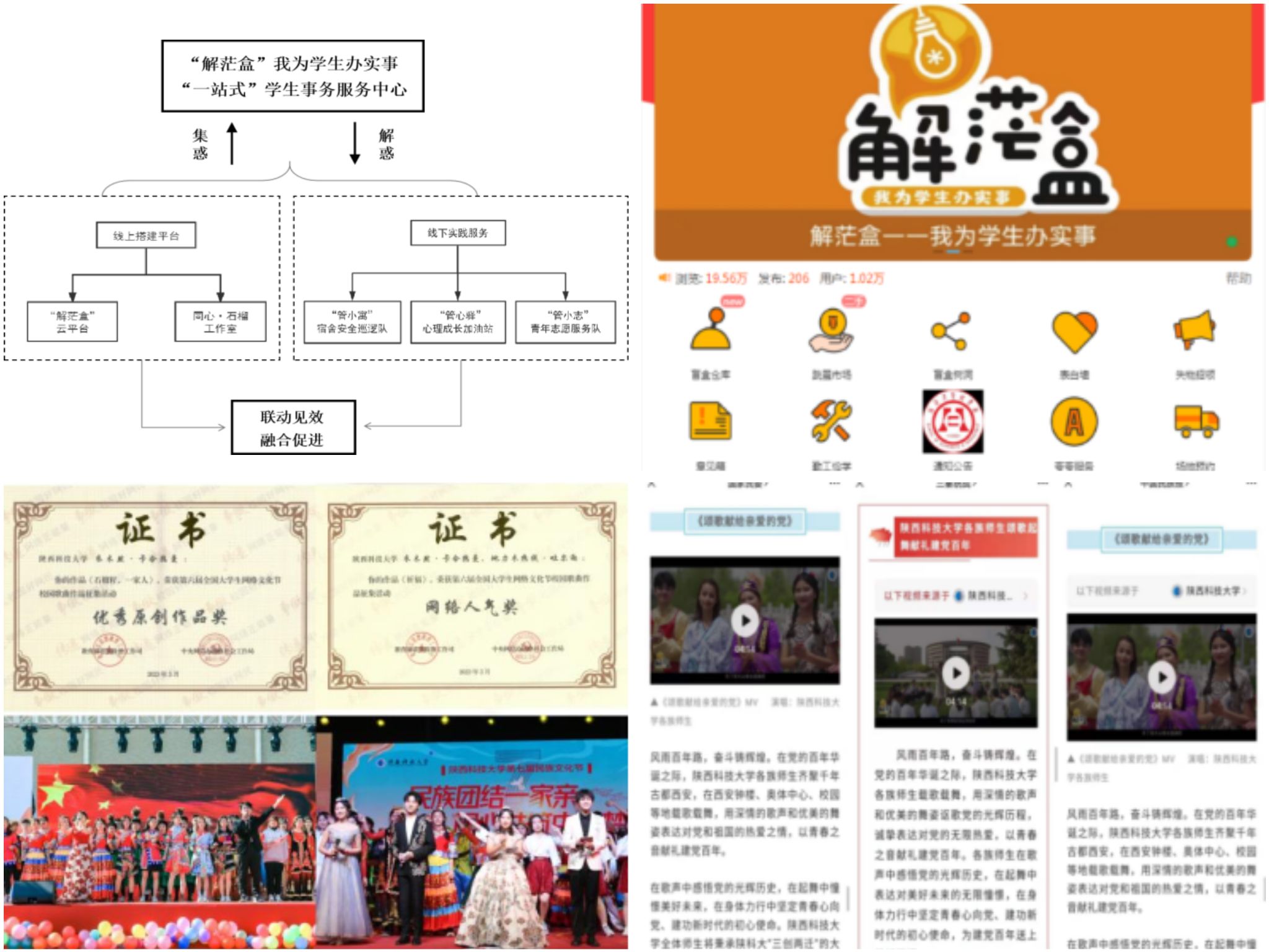 “解茫盒”我为学生办实事——“一站式”学生事务服务中心的建立是学院深入学习贯彻习近平新时代中国特色社会主义思想和党的二十大精神,落实立德树人根本任务,聚焦文科生新特点,坚持以生为本的服务理念,解决学生实际诉求的有力举措。中心将线上答疑解惑与线下实践锻炼联动融合,线上建立“解茫盒”云平台、“同心·石榴”网络文化工作室;线下设立辅导员共享学生助理岗位,并建立“管小寓”宿舍安全巡逻队、“管心驿”心理成长加油站、“管小志”青年志愿服务团三支实践服务团队。中心将网络平台与实践锻炼有效结合,一是点面结合解决学生“急难愁盼”的问题。以学生需求为导向,通过增加云平台功能,优化平台建设,增强平台服务力,为解决学生具体问题提供了途径,真正做到了为学生办实事;二是强化学生队伍培养。充分发挥学生“自我教育、自我管理、自我服务、自我监督”的作用,调动学生成长成才的主体意识,发掘与培养学生的核心优势,提升学生的综合素质;三是试图破解长期以来辅导员被事务性工作困扰的难题,将部分辅导员事务性工作下沉至学生群体,让辅导员有更多精力和时间走向学生宿舍和班级开展思政育人工作。