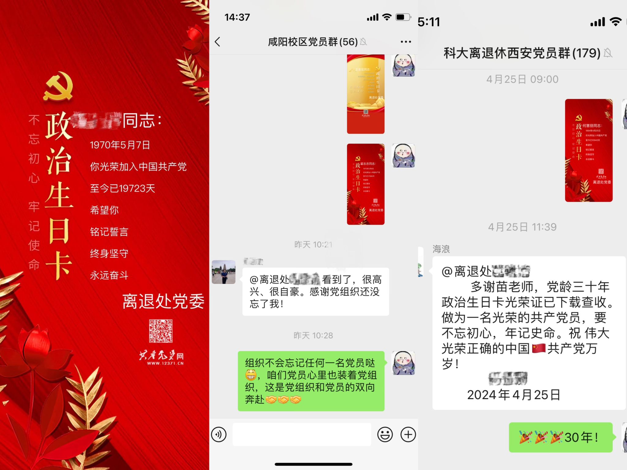为不断增强离退休党员党性观念和荣誉感、归属感,切实向老党员传递党组织的关怀,离退处党委常态化为老党员精心制作“政治生日”电子贺卡。贺卡上有老党员的名字,入党日期和迄今为至的入党天数,在老党员“政治生日”当天在党员微信群为党员赠送。发放电子“政治生日”贺卡既体现了党组织对老党员的关怀,又实现了老党员真正过上“政治生日”的愿望,深化了“互联网+”党建工作内涵。“我已在党五十年有余,始终没忘记自己的身份。我虽己八十岁了,但决不忘初心,只要党组织需要我干啥,我定会克服困难,努力去完成。”“政治生日卡光荣证已下载查收。做为一名光荣的共产党员,要不忘初心,牢记使命。祝伟大光荣正确的中国共产党万岁!”“希望我们每个党员都能够收到政治生日贺卡,体现我们广大党员光荣在党多少天。从光荣入党时间计起,不但是政治生命的开始,而且是时刻严格要求自己的警醒。”这些是部分老党员在收到电子“政治生日”贺卡后通过党员微信群发来的朴实感言。他们对组织的祝福感到无比的温馨和自豪。老党员们在收到“政治生日”贺卡的瞬间,都感受到了浓浓的“政治生日”氛围。入党时的初心、砥砺奋进的信心、为共产主义事业奋斗终身的决心再次深深感染了每个人。大家纷纷表示,过“政治生日”很有意义,党员“组织入党”一生一次,“思想入党”一生一世,加强党性修养是一辈子的事。