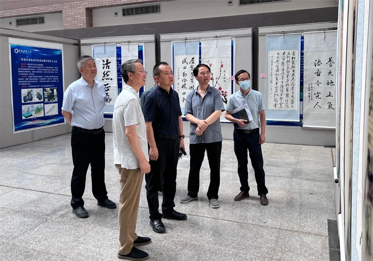 6月25日,在开幕式上,校党委副书记李学军在校纪委副书记王东、离退处党委书记张晓东、沁园书画社负责人王宏及陕科大书画协会负责人祁自敏的陪同下参观了作品展。