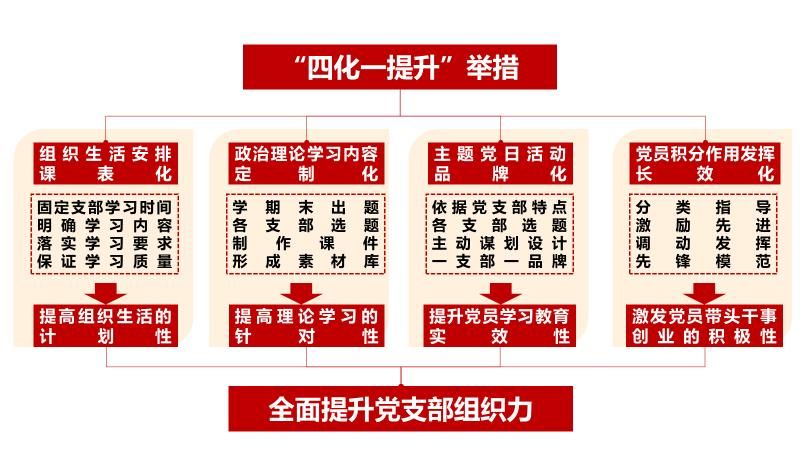 食品科学与工程学院食品系教工党支部在学院党委的领导下,支部创新性实践“四化一提升”党支部高质量建设工作举措(图1),通过组织生活安排课表化、政治理论学习定制化、主题党日活动品牌化、党员先锋作用长效化,全面提升支部组织力、凝聚力和战斗力。“四化一提升”党支部高质量建设工作举措及其成效作为典型经验受到校党委校内推广,也受到“学习强国”、人民日报APP、全国高校思想政治工作网等平台的报道推广。