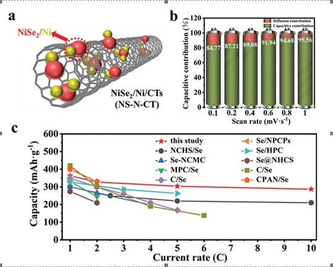 (a)NiSe2/Ni/CT的结构示意图;(b) 不同扫描速率下Se@NiSe2/Ni/CTs电极电容容量的归一化贡献率;(c) Se@NiSe2/Ni/CTs与其他报道的Na-Se电池材料的比较。