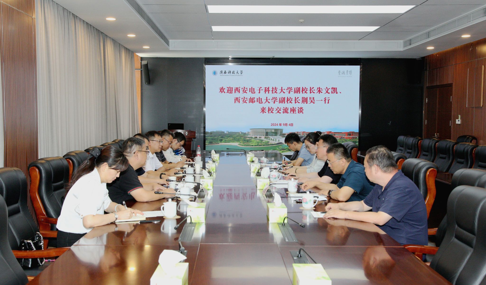 9月4日,西安电子科技大学副校长朱文凯和西安邮电大学副校长荆昊一行来校调研交流。校党委副书记郭强出席并主持座谈会。