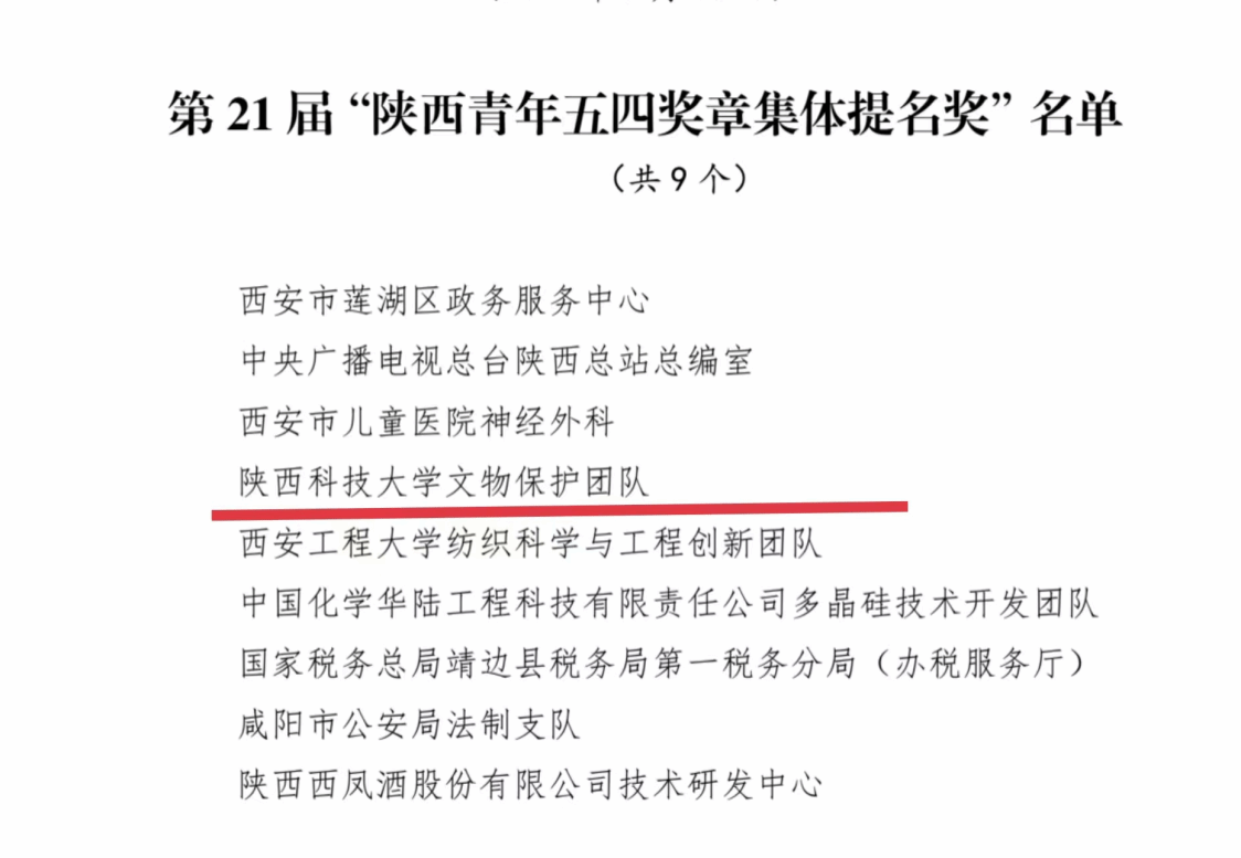 为集中展现新时代陕西青年的精神风貌与价值追求,树立坚定不移听党话、跟党走,勇担民族复兴重任的优秀青年典型,激励全省青年奋发有为,奋力投身中国式现代化建设,共青团陕西省委和陕西省青年联合会开展了“陕西青年五四奖章”评选表彰活动,近日公布了评选结果,德赢官网材料科学与工程学院(文物保护科学与技术学院)文物保护团队荣获第21届“陕西青年五四奖章集体提名奖”。