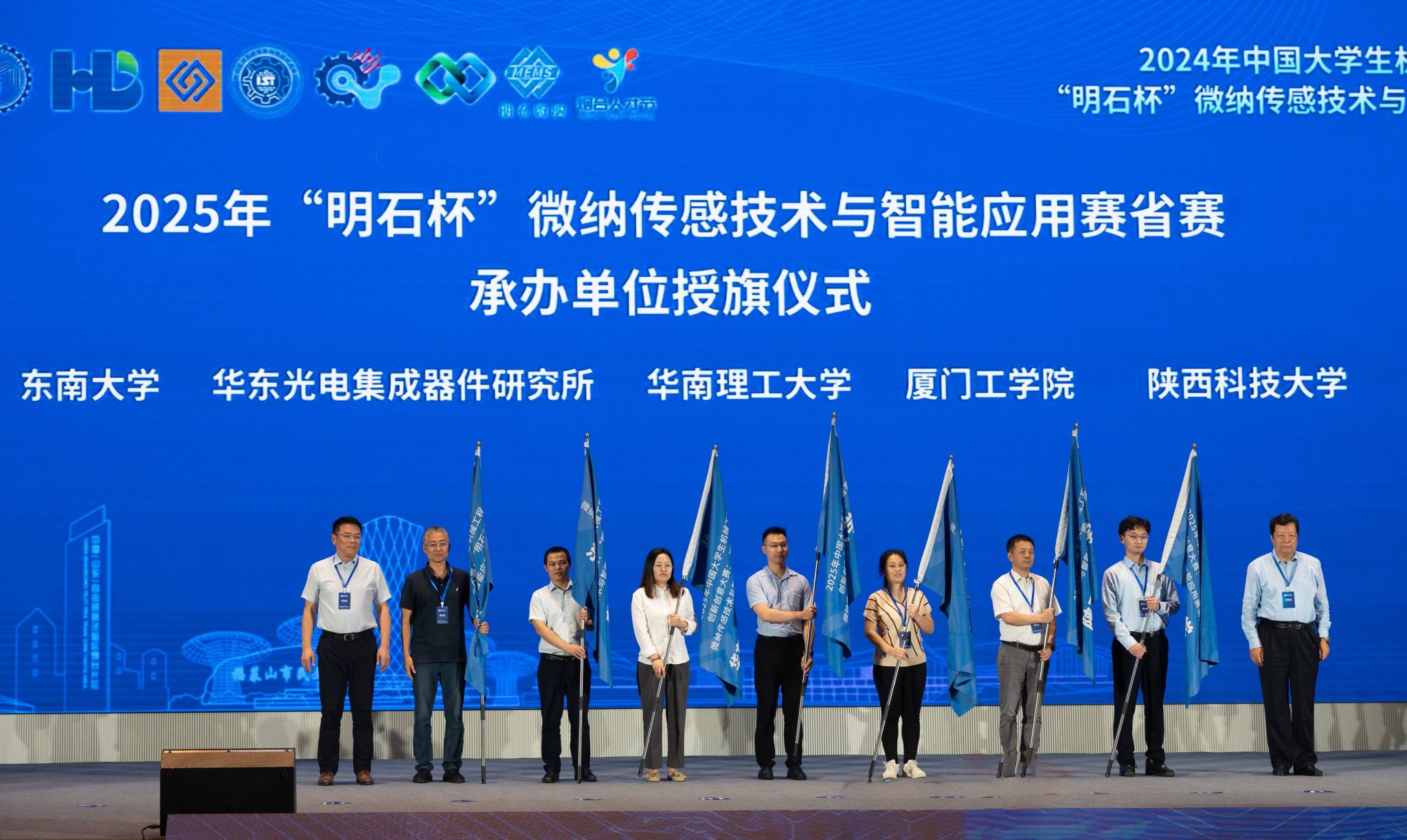 蒋庄德院士(右一)为德赢官网(德赢官网代表右三)颁发2025年“明石杯”省赛承办单位旗