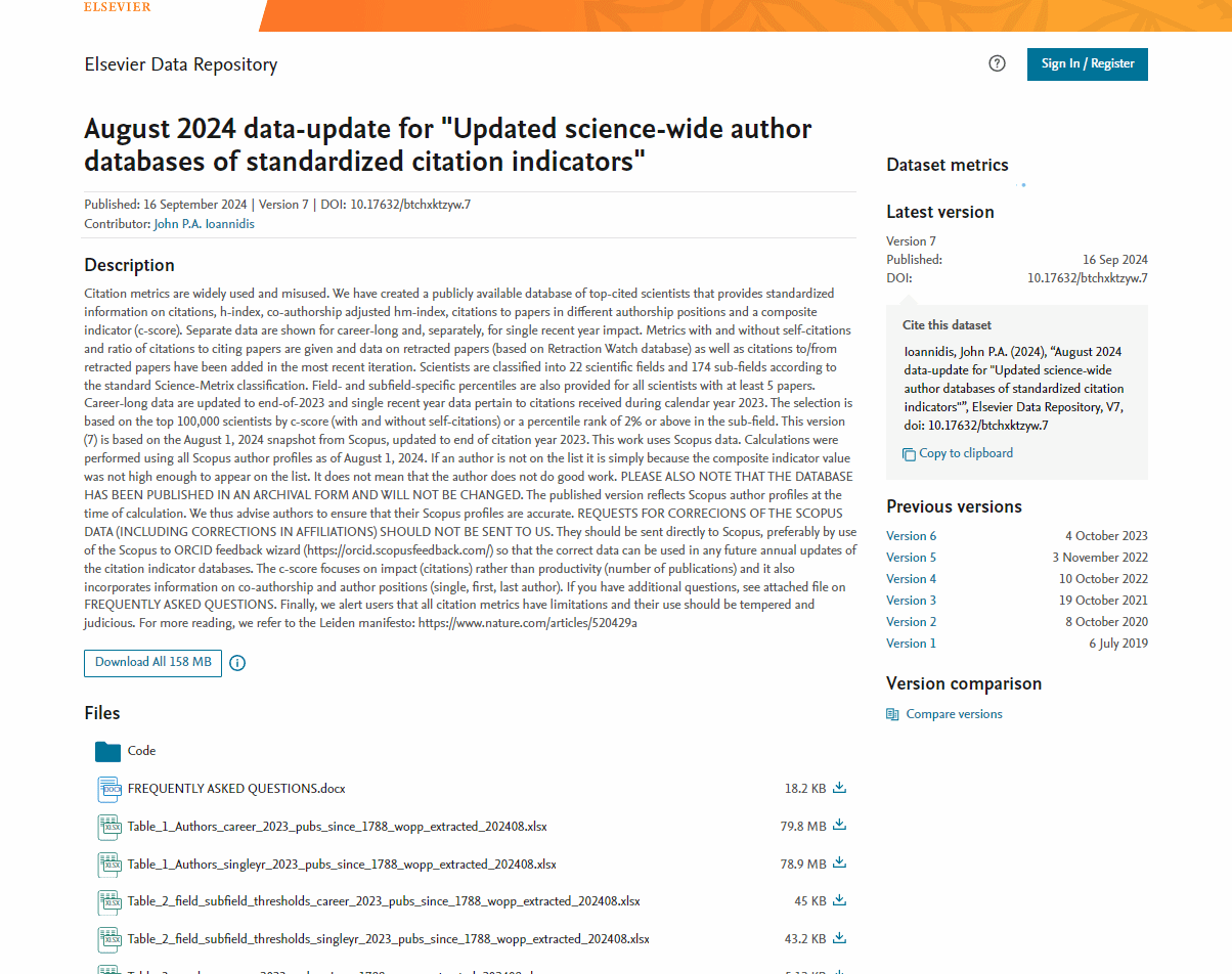 近日,美国斯坦福大学John P.A.Ioannidis教授团队和国际权威学术出版社爱思唯尔数据库(Elsevier)发布2024年度全球各学科前2%顶尖科学家榜单(World’s Top 2% Scientists 2024)。榜单分为“2024年度科学影响力排行榜”和“终身科学影响力排行榜”,其中“终身科学影响力”关注科研人员整个学术生涯迄今的影响力,“年度科学影响力”聚焦科研人员上一年度(2023)的学术影响力。