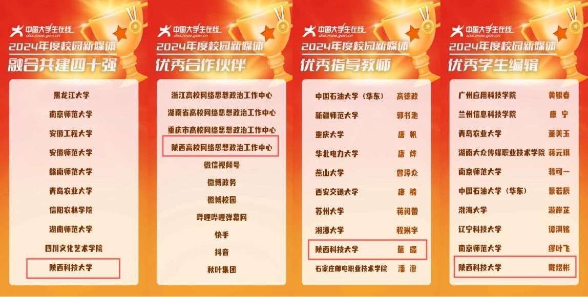 作为陕西高校网络思想政治工作中心承建高校,德赢官网积极推动全省高校与“中国大学生在线”的共建工作,在本次发布的表彰名单中,陕西高校累计斩获国家级奖项30项,创历史新高,陕西高校网络思想政治工作中心荣获“2024年度校园新媒体优秀合作伙伴”称号。