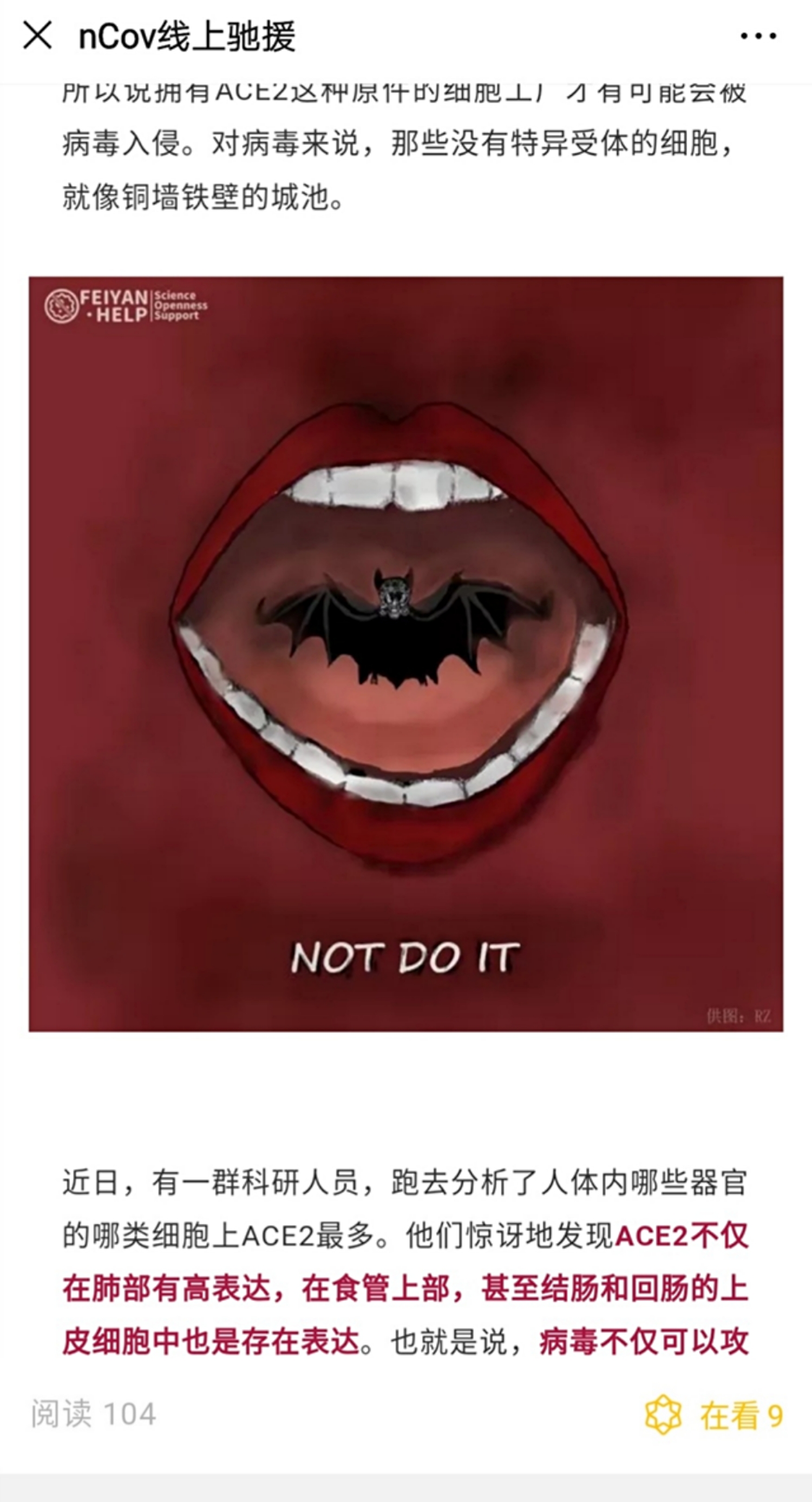 肺炎疫情发生后,环境科学与工程学院积极动员学生参与抗“疫”宣传工作,环境171班入党积极分子赵容娴同学绘制了新型冠状病毒手绘宣传海报,发布在抖音、微博、今日头条和bilibili等视频网站和社交网站上,并积极参与了微信公众号:WuHanSupport线上志愿组织,积极宣传食用蝙蝠等野生动物的危害,为武汉加油,为中国加油,收到了众多支持。学院其他学生也通过QQ空间和微信朋友圈等渠道普及防疫知识,宣传抗疫正能量。