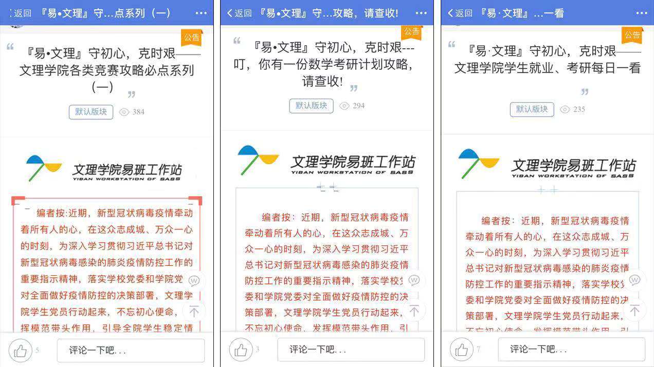 文理学院信息学生党支部结合毕业班学生就业与考研过程中存在的信息不畅通、技能缺乏等问题,将春招信息、考研复试信息、面试技巧等有效整合,在易班平台每日推送,为毕业班同学做好防疫期间的信息服务与技能指导。数学学生党支部从考研准备、就业经验等方面开展线上分享。物理及英语学生党支部结合专业特色,将各类创新创业竞赛以及专业竞赛等赛事信息、备赛攻略进行分享交流。为新学期学生学业、科技创新、就业、考研等工作做好准备。
