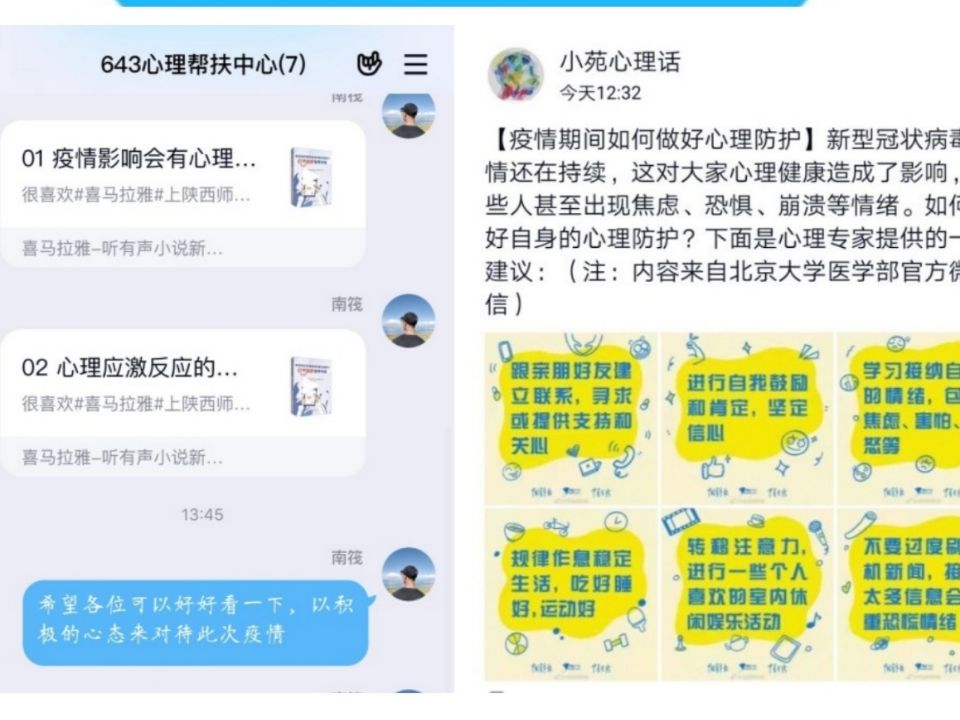针对疫情防控期间可能会出现的学生心理困扰,学生党支部协同学院心理协会成立心理帮扶小组,将设岗定责人员、宿舍长、班级心理委员等学生干部联结起来,积极了解学生群体的心理健康状况,以宿舍为单位开展线上心理帮扶、政策宣讲等工作,同时建立“小苑心里话”官Q互动平台,在这个特殊时期,努做好学生群体的情绪疏导,帮助他们做好心理防“疫”!