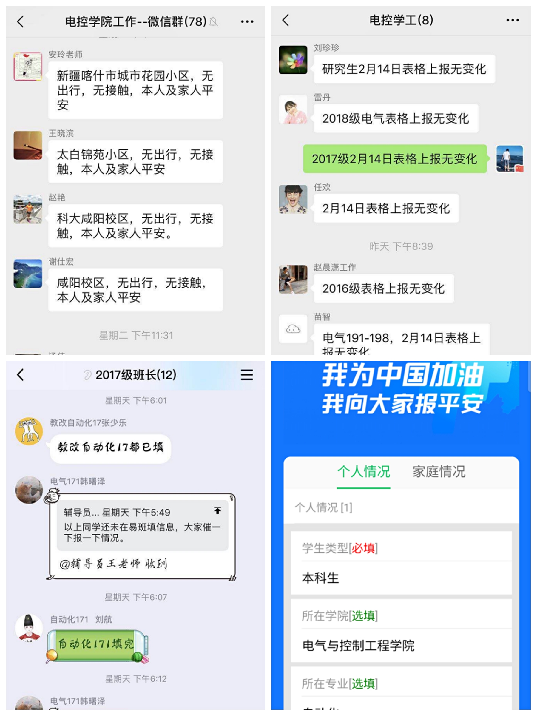 学院党委积极防控部署,全面了解掌握全院师生寒假期间的外出情况、现居住地、本人及家属的身体状况。建立疫情信息台账,全院教工均能做到每日在规定时间内通过学院微信、QQ群等途径报告本人及同住亲属状况,学院疫情防控工作联络员每天按时通报疫情防控和外地返校教职工动态。全体学生在学校易班信息上报开通前即开始每日报送个人信息动态,后期进一步通过易班加强学生信息核对,各年级辅导员及学生干部逐层把关,实行实时数据更新汇报,实现线上线下多渠道联防,按时做好疫情报告工作。