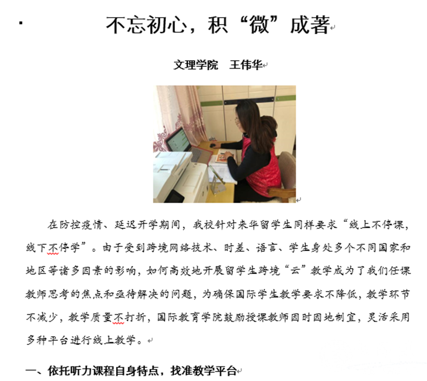 加强线上监控,提升教学质量。教学质量是学校发展的生命线,课堂是提高教学质量的主阵地。国际教育学院坚持深入一线课堂,多元化、全方位、持续性、多角度对各授课教师教学情况认真进行跟踪检查,通过查看考勤、听课、查备课,关注课堂氛围;收集了大量的教学过程材料和线上教学数据,积极为教师教学服务。