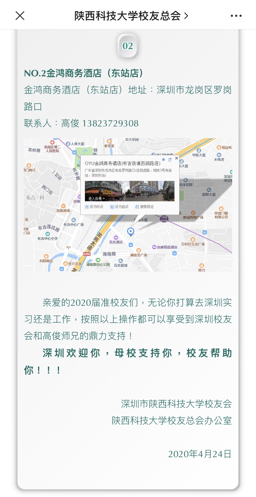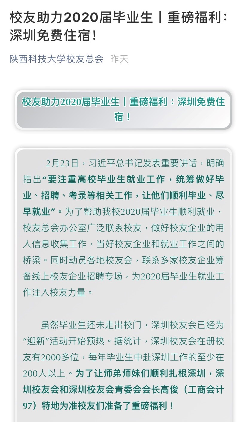 虽然2020届毕业生还未走出校门,各地校友会已经开始为这些准校友们“回家”做好提前的准备,为“迎新”活动预热。据统计,深圳校友会目前在册校友超2000名,而近三年的毕业生中,选择赴深圳工作的每年至少在200人以上。“我希望能尽自己努力帮助来深圳的师弟师妹们,无论他们是来深圳实习、找工作还是准备在深圳打拼,都可以联系我,我来提供力所能及的服务!我想对他们说,即使他们离开了西安离开了校园,但是在深圳仍然有自己的家人!”高俊校友如是说。在疫情防控的特殊时期,高俊校友为2020届毕业生留在深圳提供了极大的便利,不仅体现出了企业家高度的社会责任,更体现出校友与母校之间深厚的感情、与师弟师妹之间浓浓的校友情。