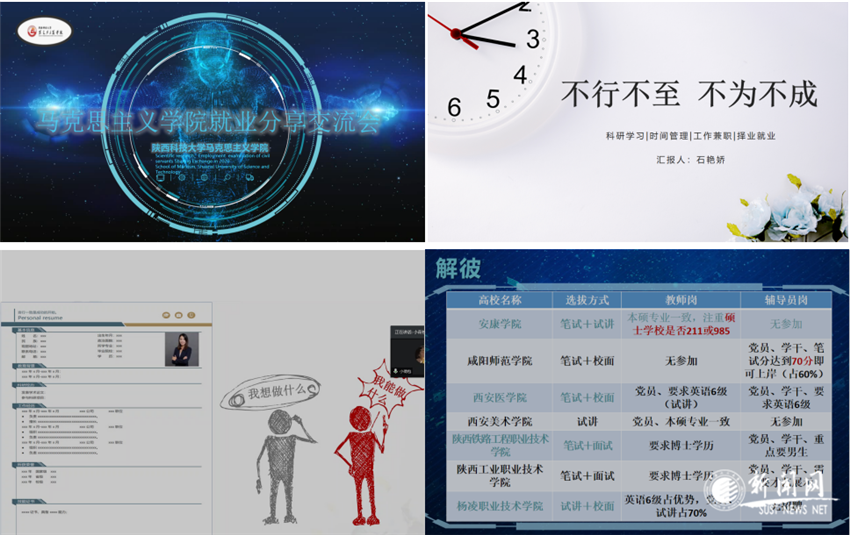 分享会上,王思嘉结合自身从乡镇村官到县直机关,再到市委组织部,后又考入省人防办,几年来公务员考试的亲身经历,从“是什么?为什么?怎么考?”三个方面进行了公务员考试的经验分享,提醒同学们备考公务员,首先要正确理解公务员的职业属性,其次要合理设定职业目标,第三要掌握科学高效的备考方法。即将入职咸阳师范学院思政课教师的石艳娇同学,首先用“我想做什么?”和“我能做什么?”引发同学们思考,紧接着从就业前提、就业要求和就业准备三方面,最后提醒同学们要善于学习,敢于尝试,不断提升自己,积极主动提前做好求职各项准备。签约杨凌职业技术学院思政课教师的霍登煌同学,分别“从目标定位:知己解彼此”“优化简历:推销自我”“畅通信息:沉着报考”三个方面,结合求职经历,带领大家一起分析了就业方向和面试基本要求、简历制作技巧、备考注意事项等,并针对会前收集到的同学普遍关注的求职和学业问题,一一解答。
