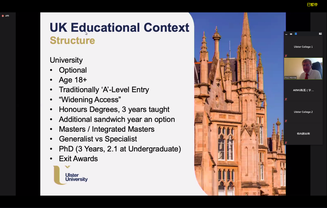 2020年7月6日至9日,德赢官网阿尔斯特学院联合英国阿尔斯特大学集中开展系列线上教师培训,旨在推进建设2020-2021学年阿尔斯特学院开设的共建课程(Joint Development Module)和引进课程(Modules Delivered by Ulster)。此次培训的主要对象为阿尔斯特学院各专业负责人、承担阿尔斯特学院2020-2021学年共建课程和引进课程的授课教师及辅导教师。阿尔斯特学院副院长(主持工作)薛朝华、副院长赵雪妮、院长助理魏倩茹及相关工作人员等一同参加培训。