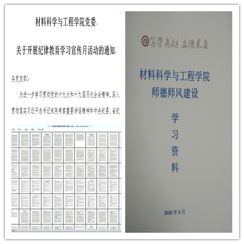9月上旬,学院党委下发《材料学院党委关于开展纪律教育学习宣传月活动的通知》,精心组织、分类指导各级党组织和广大党员开展纪律教育学习活动。为增强师生党员纪律教育学习针对性,学院党委还组织编印《党纪法规知识-资料汇编》和《材料科学与工程学院师德师风建设学习资料》,涵盖总书记讲话、党纪党规、师德师风、经费管理文件制度等方面28个篇目。