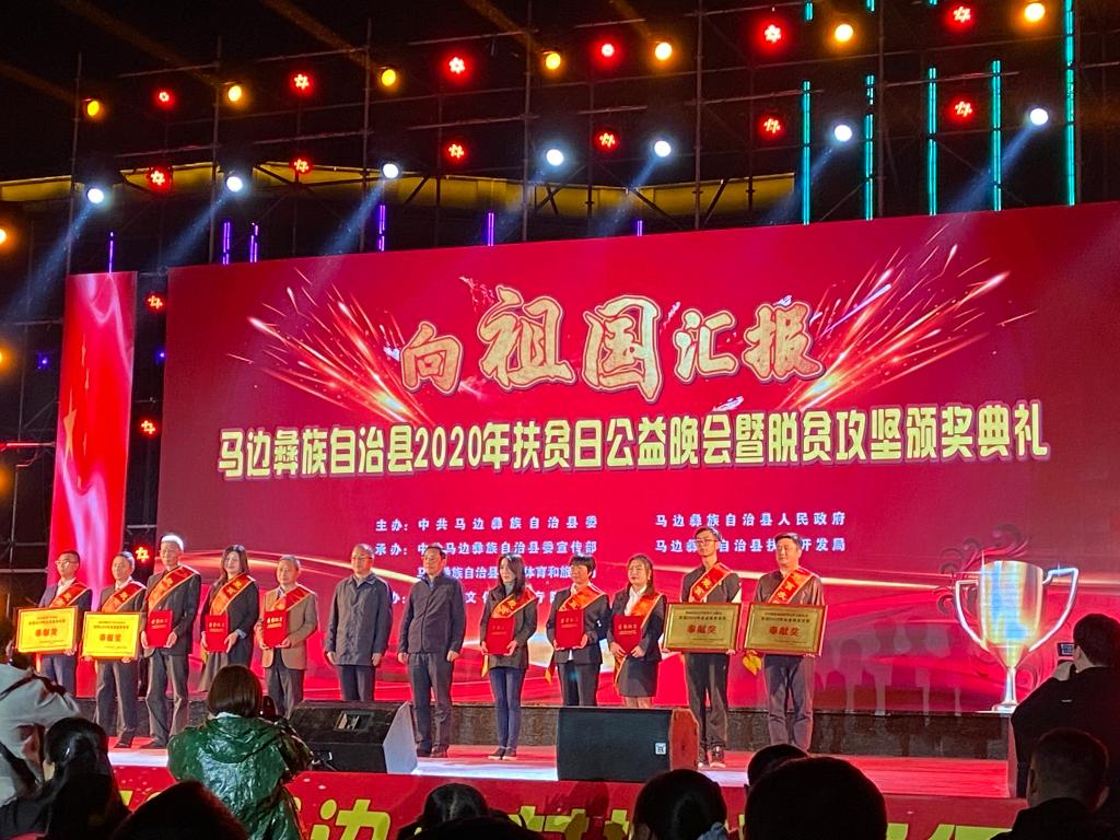 在第七个“国家扶贫日”来临之际,10月19日晚四川省乐山市马边彝族自治县在马边广场举行“2020年扶贫日公益晚会暨脱贫攻坚颁奖典礼”,全方位展示马边县在过去一年脱贫攻坚工作中所取得的重大成果,并对脱贫工作中涌现出的先进集体和个人进行表彰。德赢官网Vwin研究生支教团受邀参加本次公益晚会,并荣获由马边县委和马边县政府共同颁发的“2020年全县脱贫攻坚奉献奖”。