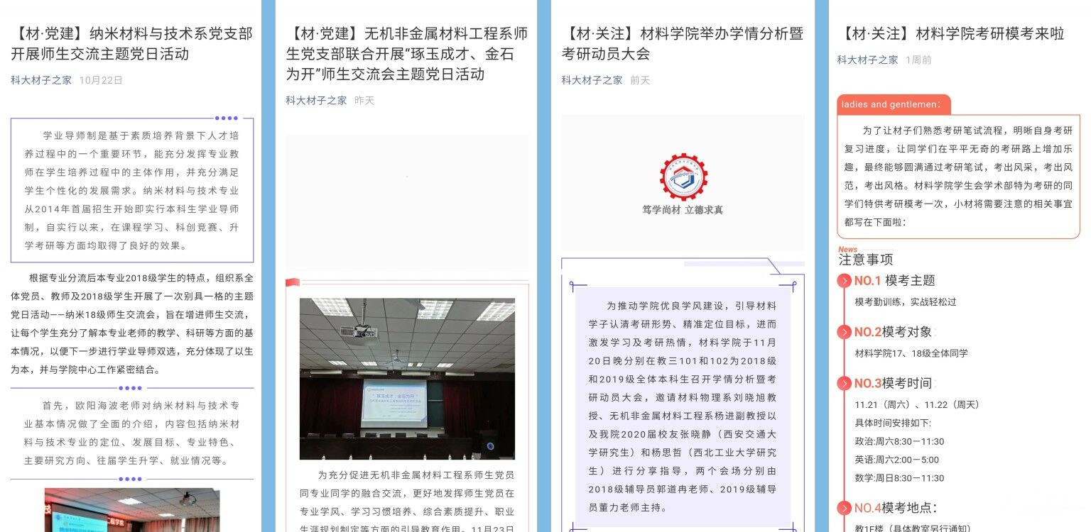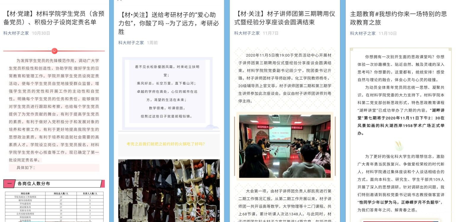 材料学院历来注重发挥学生朋辈在学风建设和考研引导方面的作用。11月5日,“材子讲师团”第三期聘用仪式暨经验分享座谈会圆满结束,聘请化工学院杨冬、材料学院赵婷两位老师为本学年的“材子导师”,聘请17名同学为新一期材料讲师。本年度“材子讲师团”共开设高等数学、大学物理等12门课程,上课68节,累计听课人数1348人。10月30日,材料学院学生党员设岗定责名单发布,学生党员、预备党员、积极分子亮牌上岗,职责清晰,学生党务中心加强过程考核和结果运用,其中学风、舍风岗的申请人数超过全部岗位的60%。较往年不同的是,本学期为大一、大二每个行政班级配备3名高年级党员,专门负责晚自习的考勤和管理,帮助学生养成良好的学习习惯,为高质量就业和考研打下良好基础。