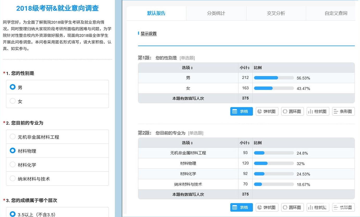 为全面了解学生学习情况,摸清学生思想困惑,材料学院点面结合,针对不同学生群体开展了深入广泛的学情调研。针对大一、大二低年级学生,围绕学习投入、兴趣、规划、积极心理情绪等方面组织700余名学生参与调研,针对大三学生,从学习状态、考研就业目标等方面了解学生对学业指导的需求和建议,针对教改班学生,从培养定位、导师选择、考研保研等方面广泛了解学生动态。不同层面的调研通过问卷星线上开展,科学设计,高效施行。此外,学院还通过集体座谈和个体谈话相结合的方式面向109名学生进行了调研,梳理出理想信念、学业和职业规划、专业自信等7类学生思想困惑,为学院全面、科学、高效开展学业指导提供了详实的数据支撑。