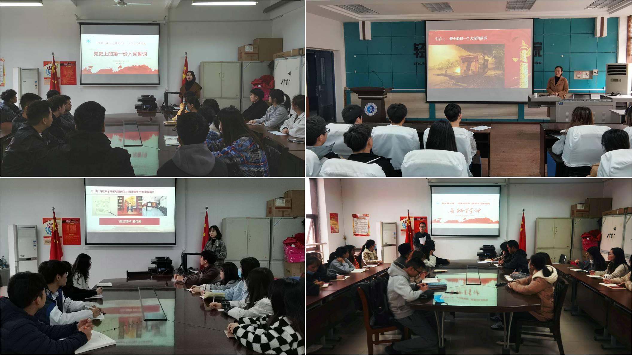 研究生第一党支部书记郝建武以“长征精神”为切入点,从长征的背景过程、典型故事等为支部党员讲党课,引导党员明确青年时代担当,发挥党员先锋作用。全体党员一致表示,将沿着革命先辈开辟的精神路线,百折不挠,不懈奋斗,走好我们这一代人的“长征路”;研究生第二党支部书记李丹围绕“西迁精神”的时代背景、深刻内涵等带领支部党员深刻领会“西迁精神”的时代意义,启发大家深入思考青年党员应如何传承好“西迁精神”,用实际行动擦亮标签,做好新时代“领跑员”;本科第一党支部书记张维静以“红船精神”主题给支部党员上了一堂生动而又形象的党课,她从“一艘小船和一个大党”的故事讲起,深刻解读“红船精神”内涵,并结合身边事例引导广大党员坚定理想信念、敢于担当、勇于创新,在为党和人民事业的奋斗中实现青春价值、创造人生辉煌;本科第二党支部书记刘红带领支部党员重温了入党誓词,围绕我党第一份入党誓词的诞生,阐述入党誓词的含义和时代背景,启发学生党员要知史明史、以史为鉴,引导广大党员对照入党誓词检视自身、对照问题找差距,号召广大党员在学习生活中积极发挥先锋模范作用。
