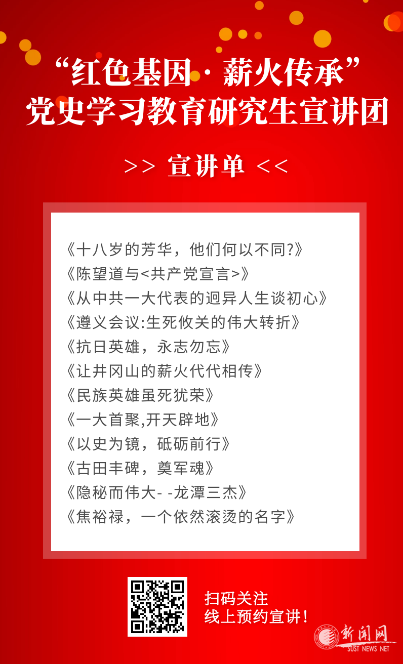目前,宣讲团已成功加入“陕西高校青年爱国奋斗宣讲联盟”,后续将遴选优秀宣讲员深度参与到陕西大学生“青春告白祖国”党史学习教育微宣讲团宣讲活动中去。