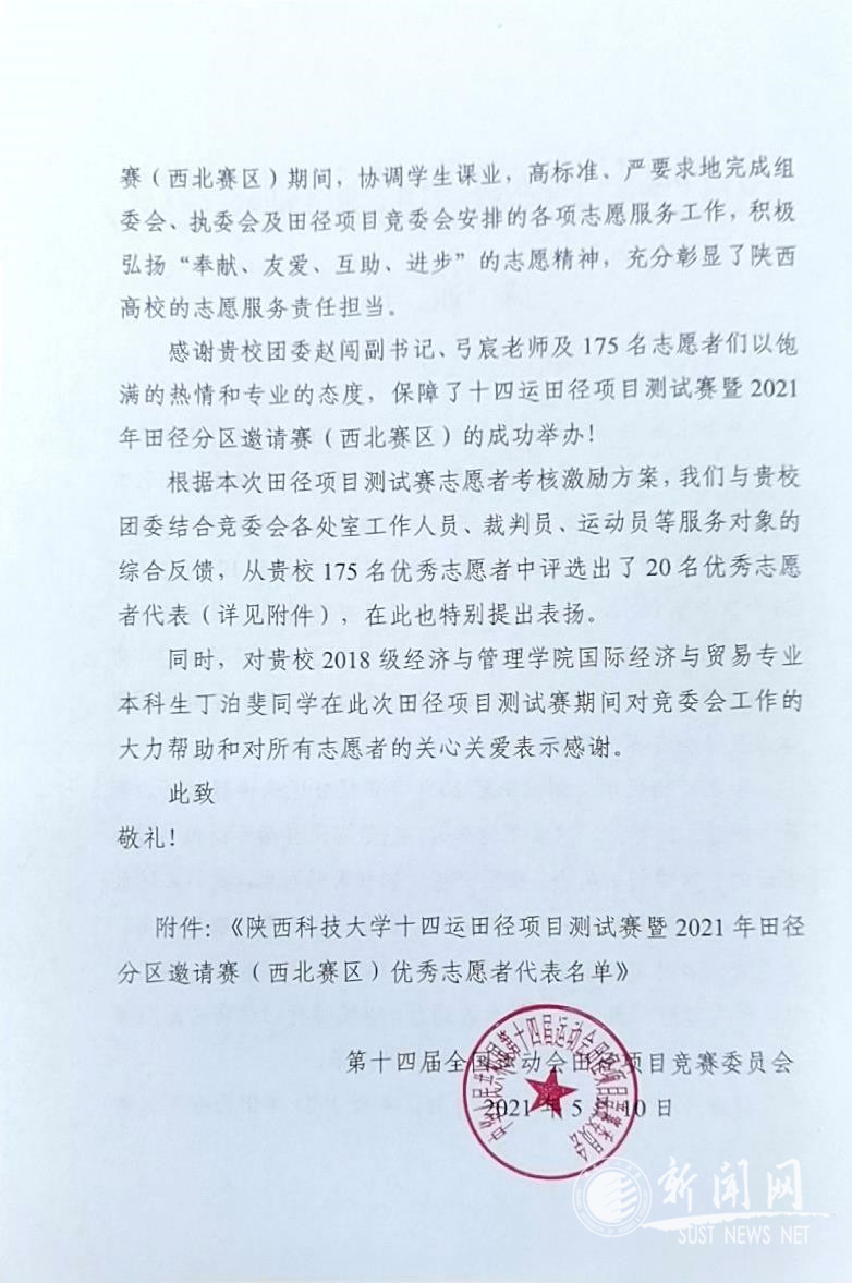 近日,德赢官网收到第十四届全国运动会田径项目竞赛委员会发来的感谢信。赛委会在信中对德赢官网175名志愿者在田径项目测试赛间的服务工作给予了高度肯定,并对德赢官网大力配合十四运志愿者工作表示了感谢。